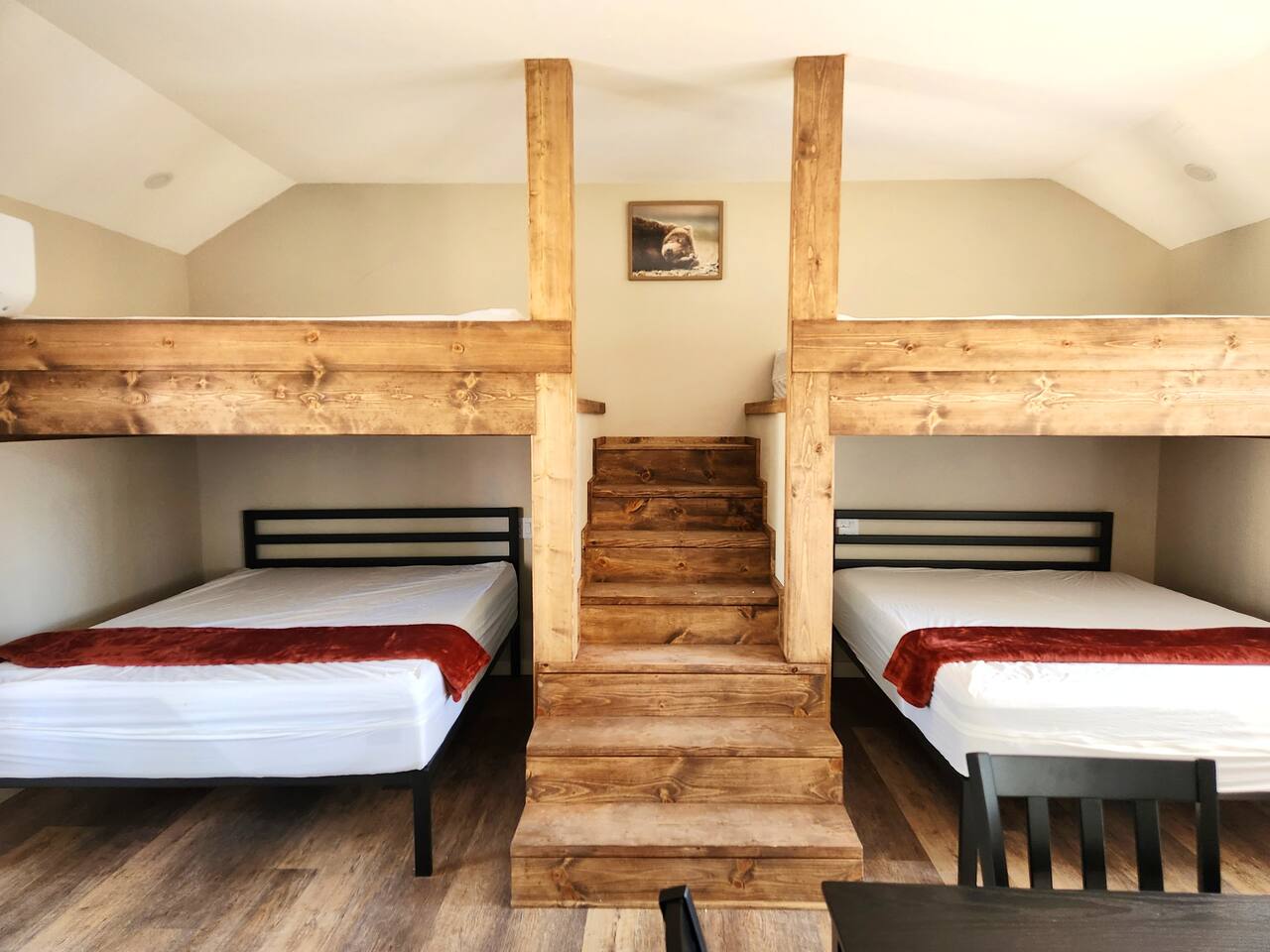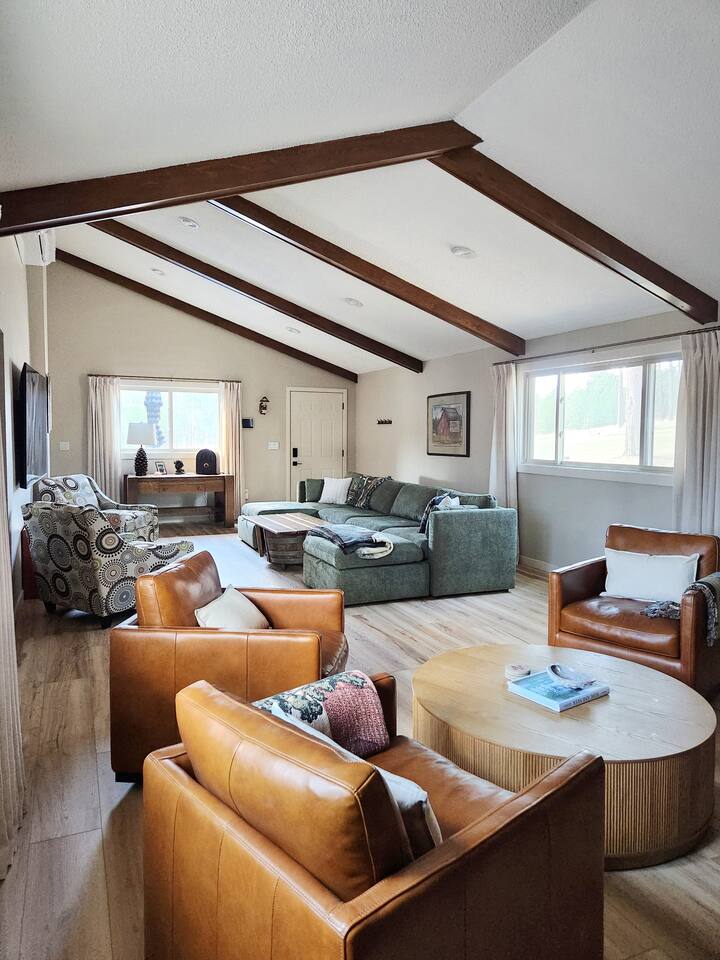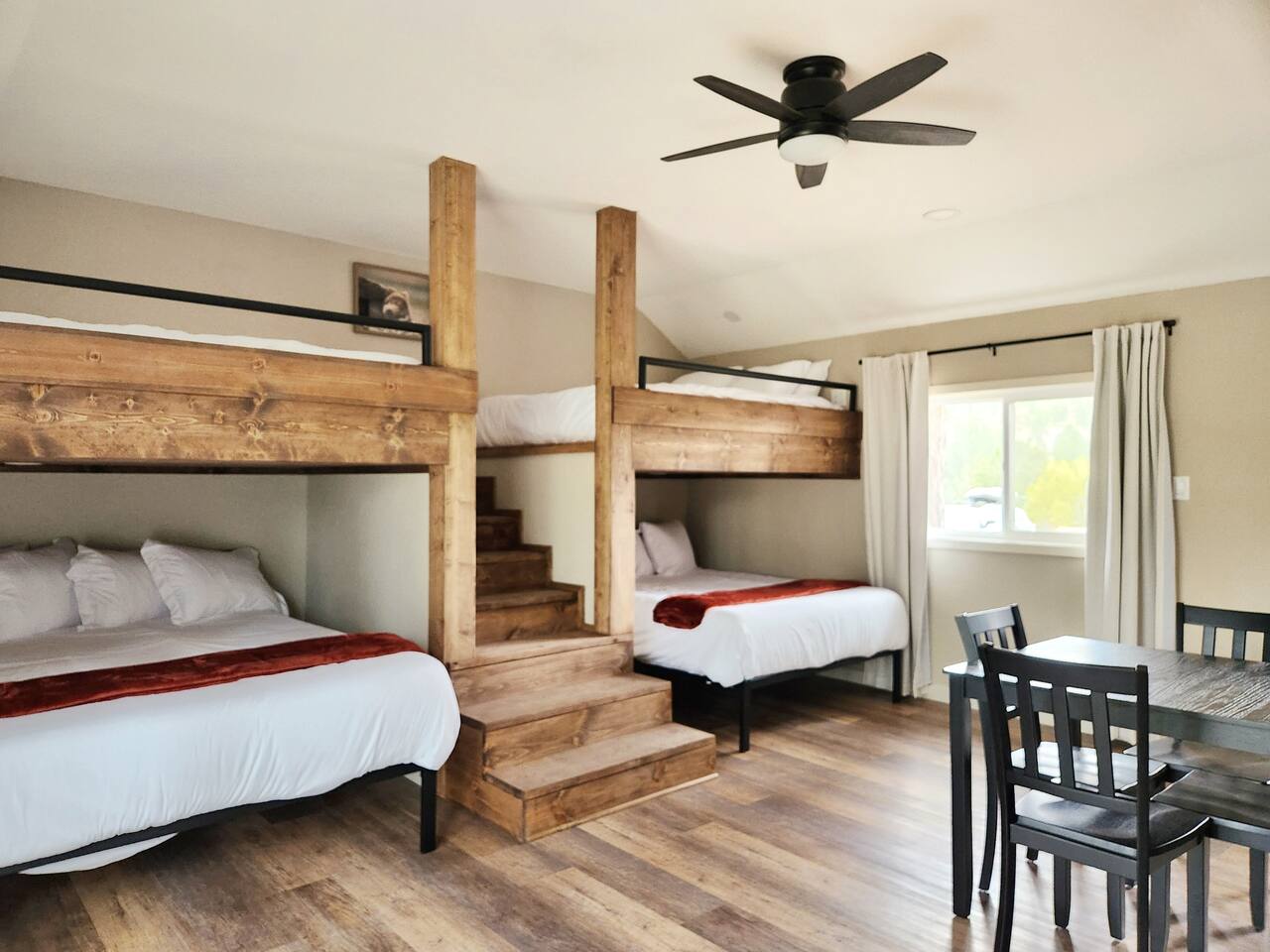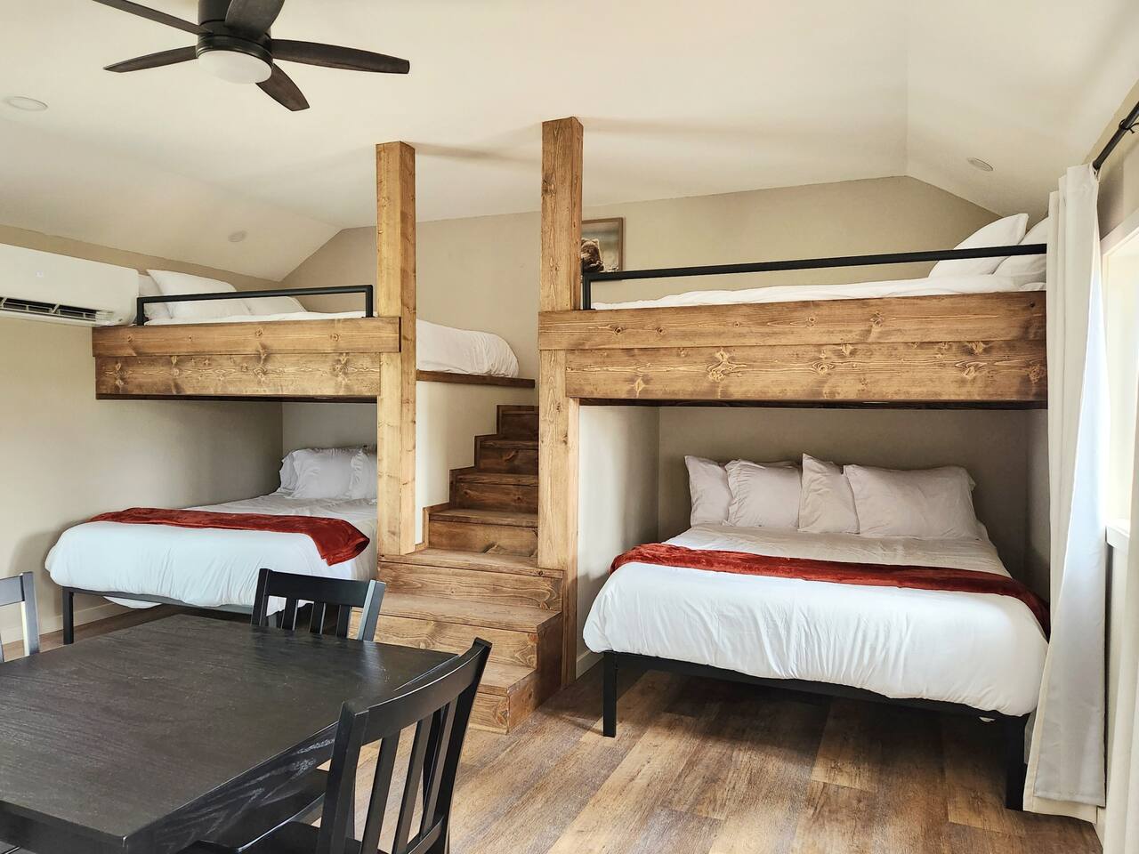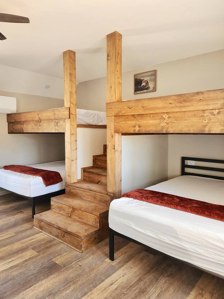 Our 2025-renovated property includes: • Main Cabin: 4 comfortable bedrooms, 2 full bathrooms, and a fully equipped kitchen. • Bunkhouse: 4 queen beds, a kitchenette, and a full bathroom—perfect for larger groups or families.